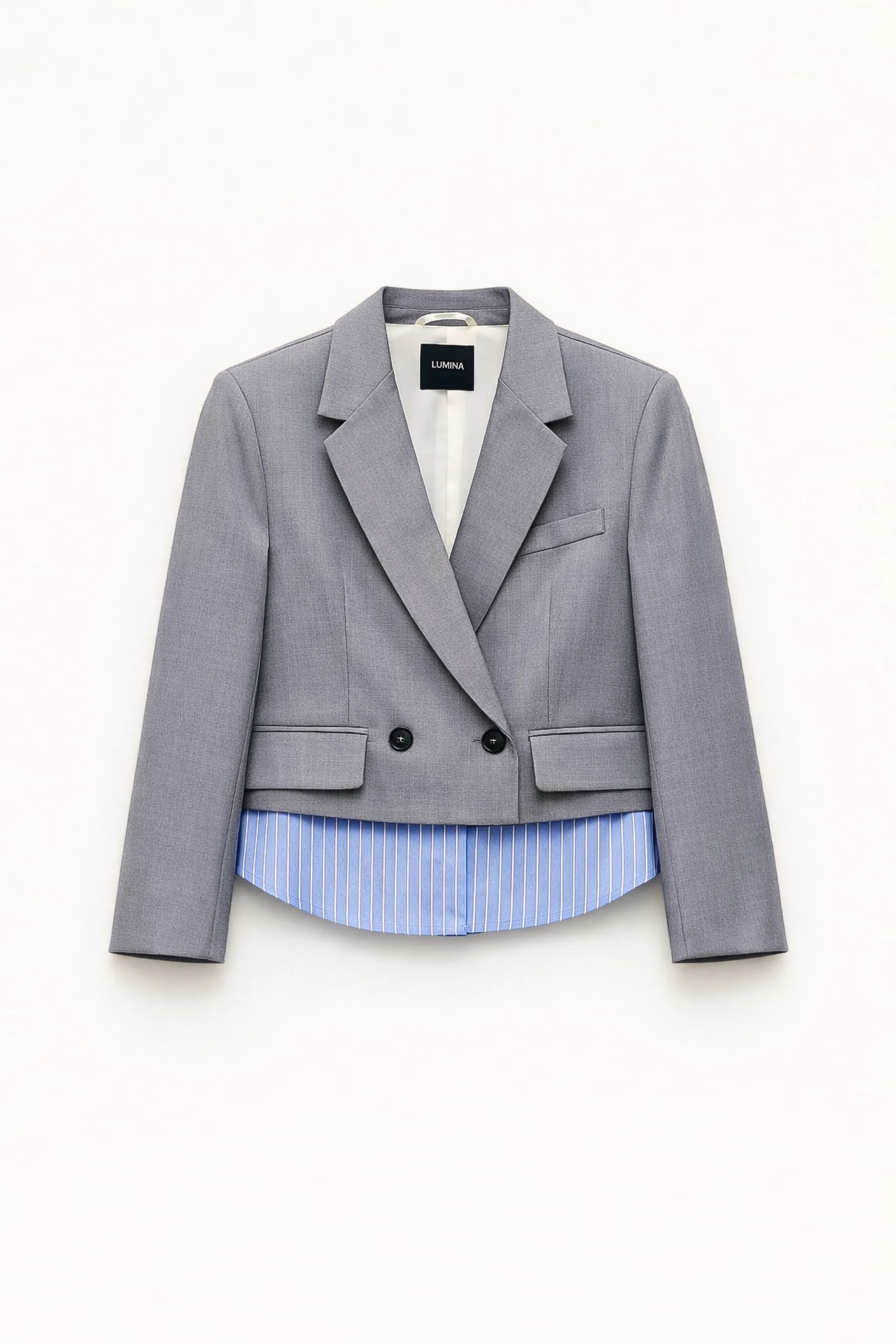 Μακριά μανίκια και επενδεδυμένοι ώμοι.Σταυρωτό κλείσιμο με κουμπιά.