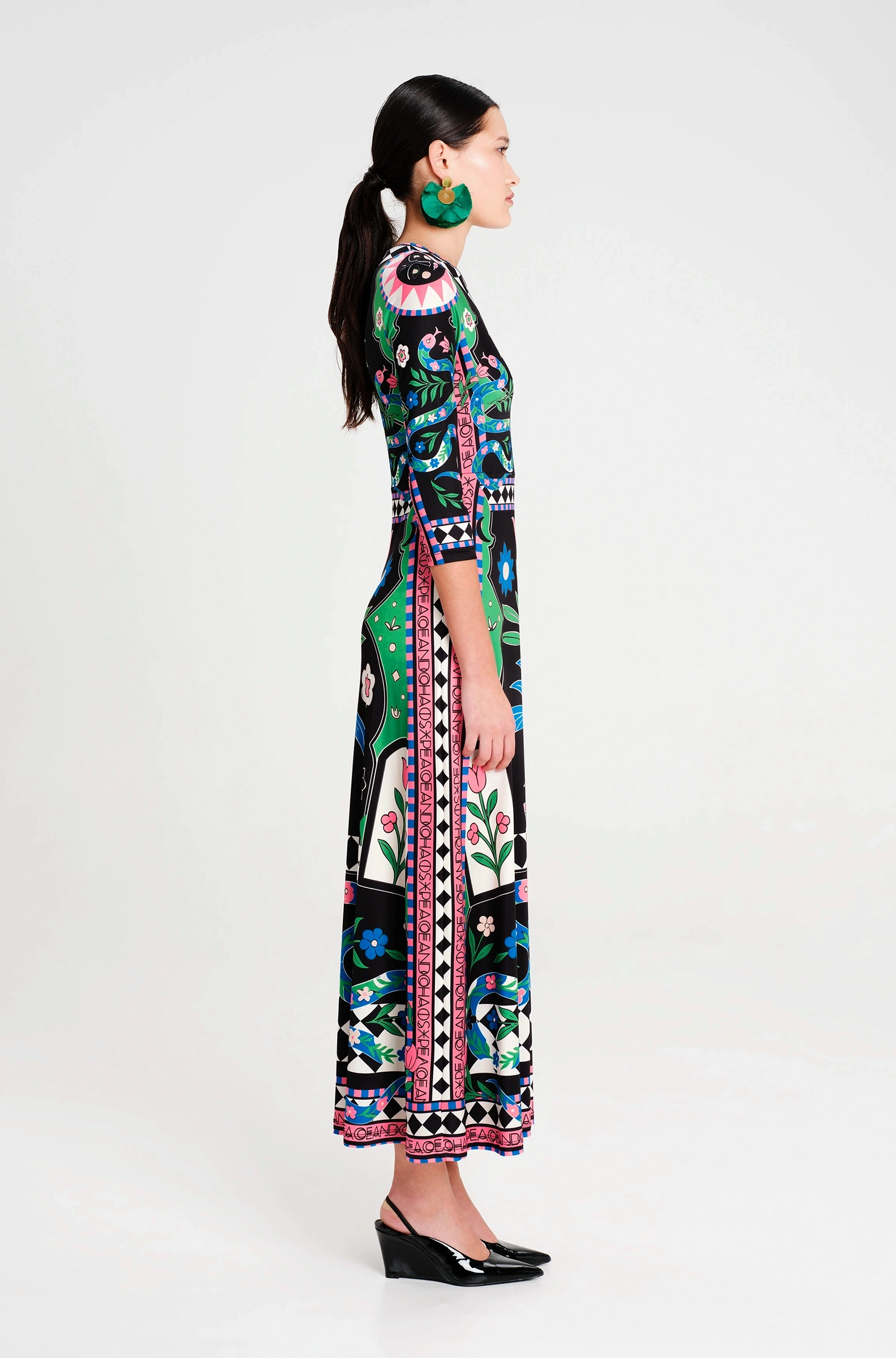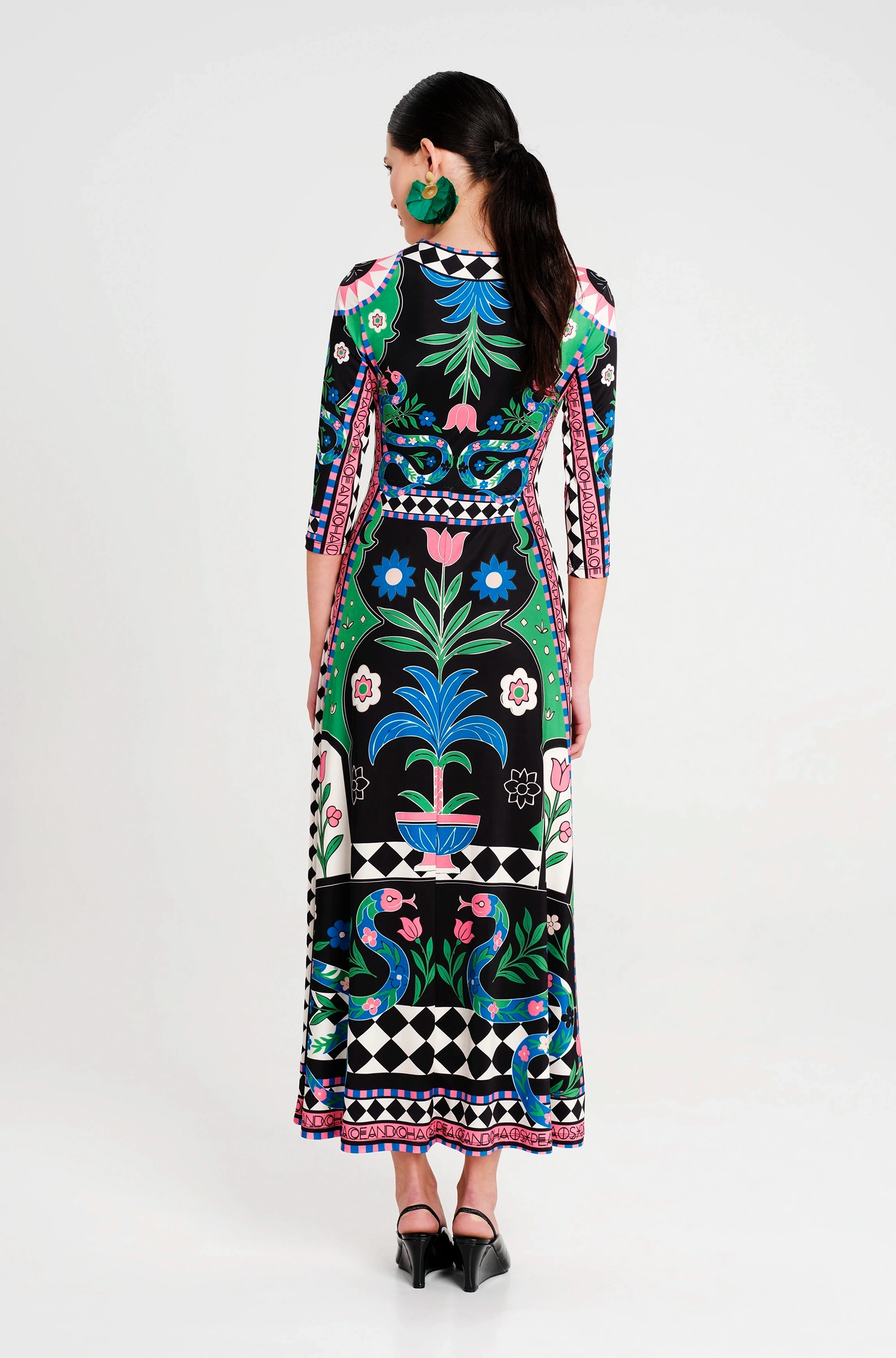 Το Manifestation Maxi Dress είναι ένα μακρύ φόρεμα με άνετη και κομψή γραμμή. Είναι φτιαγμένο από μαλακό, ελαστικό jersey ύφασμα και ανοίγει σε Α-γραμμή. Έχει σχέδια εμπνευσμένα από τον Κήπο της Εδέμ, ενώ οι ασπρόμαυρες γεωμετρικές λεπτομέρειες τονίζουν τη μέση και ξεχωρίζουν πάνω στο φόρεμα.