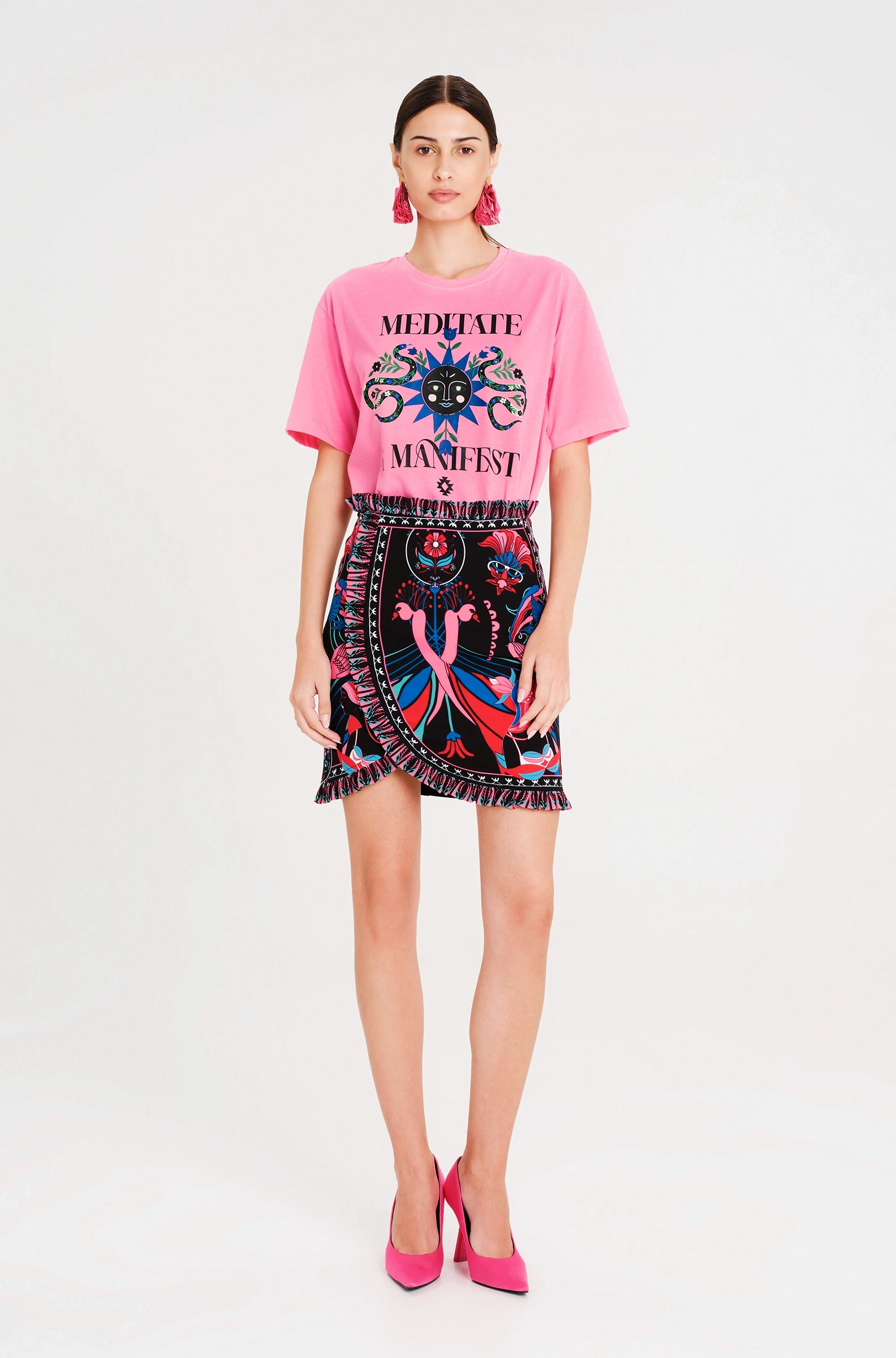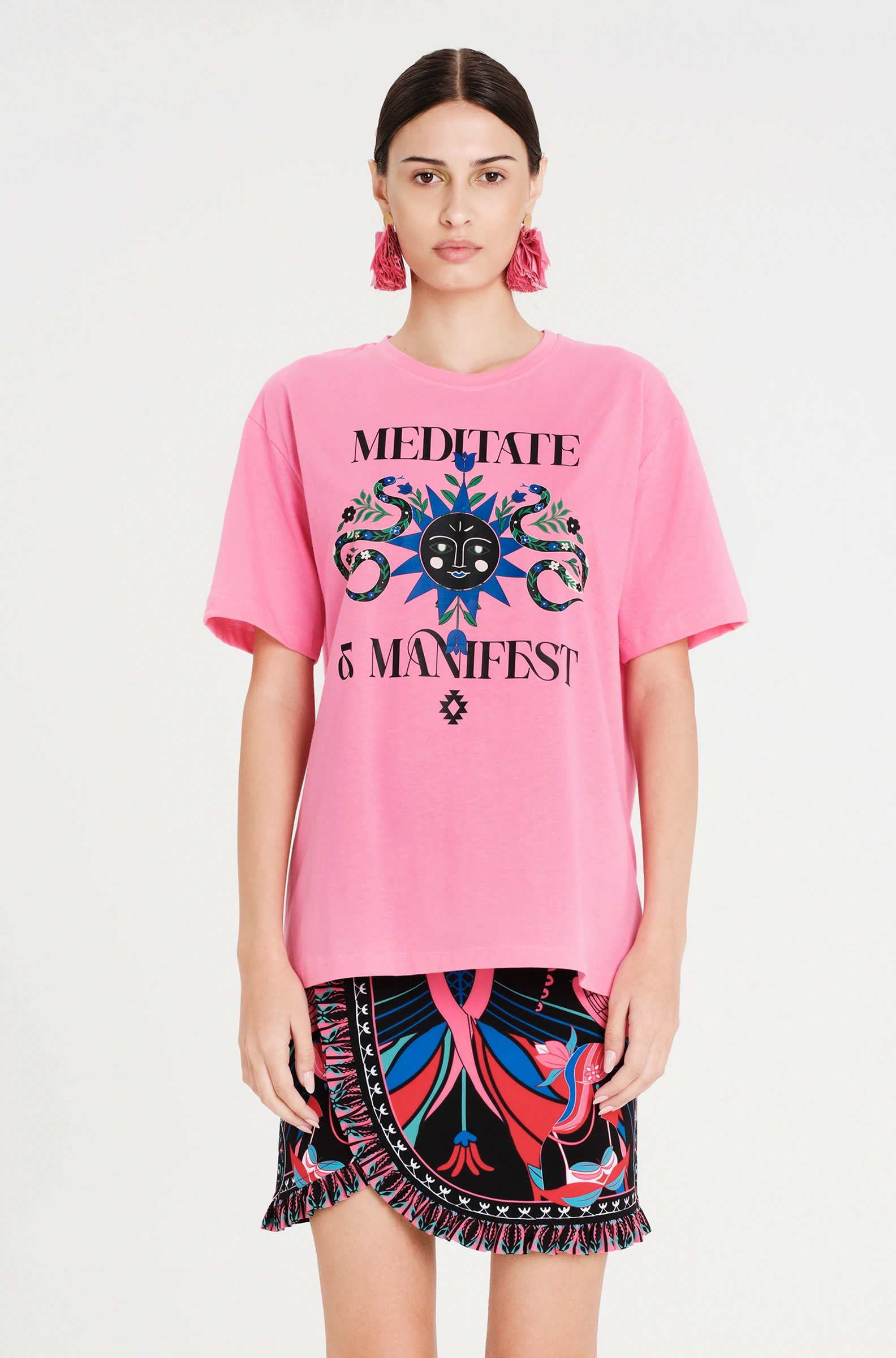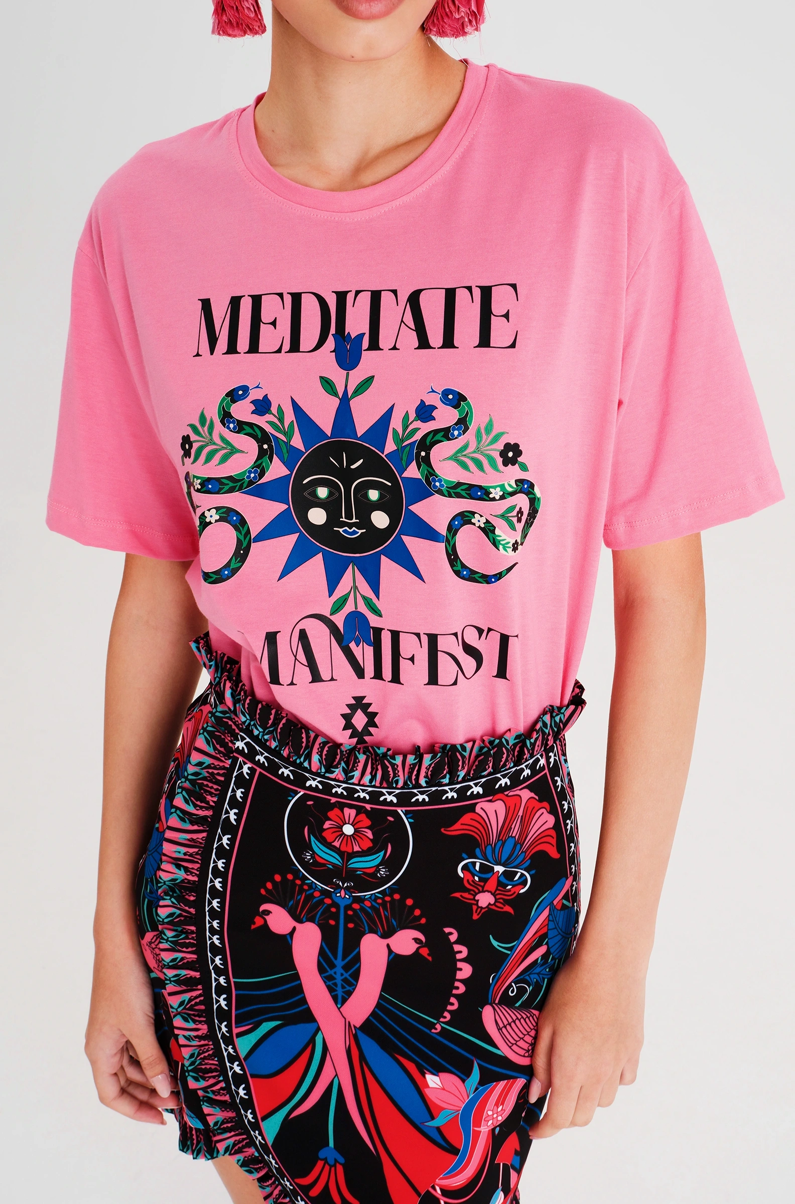 Το Manifestation T-Shirt έχει χαλαρή γραμμή και είναι φτιαγμένο από βαμβακερό ύφασμα, συνδυάζοντας άνεση και στιλ. Το έντονο print του περιλαμβάνει φίδια, ήλιους και στοιχεία με σύμβολα. Διατίθεται σε ροζ ή μπλε χρώμα και μπορεί να φορεθεί με τη Cosmology Mini Skirt.
