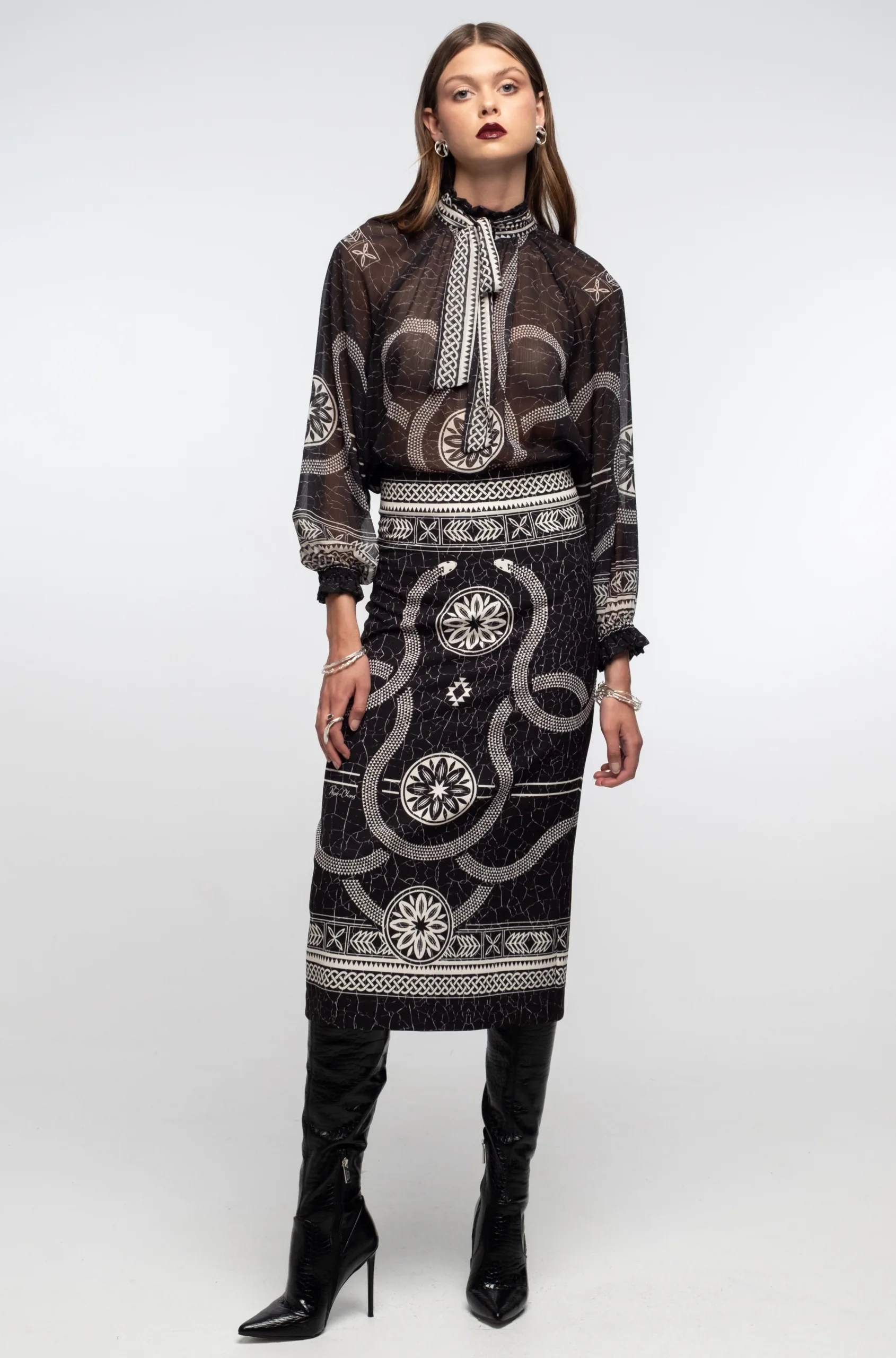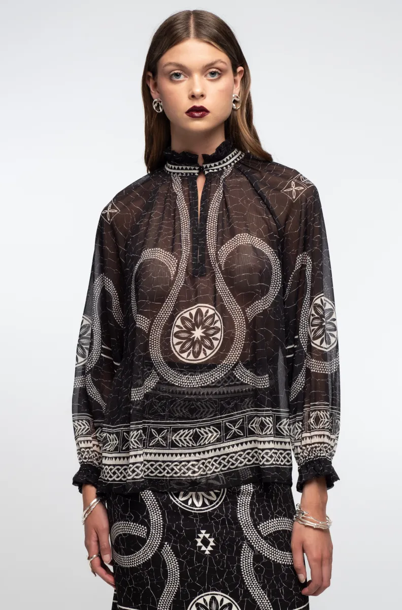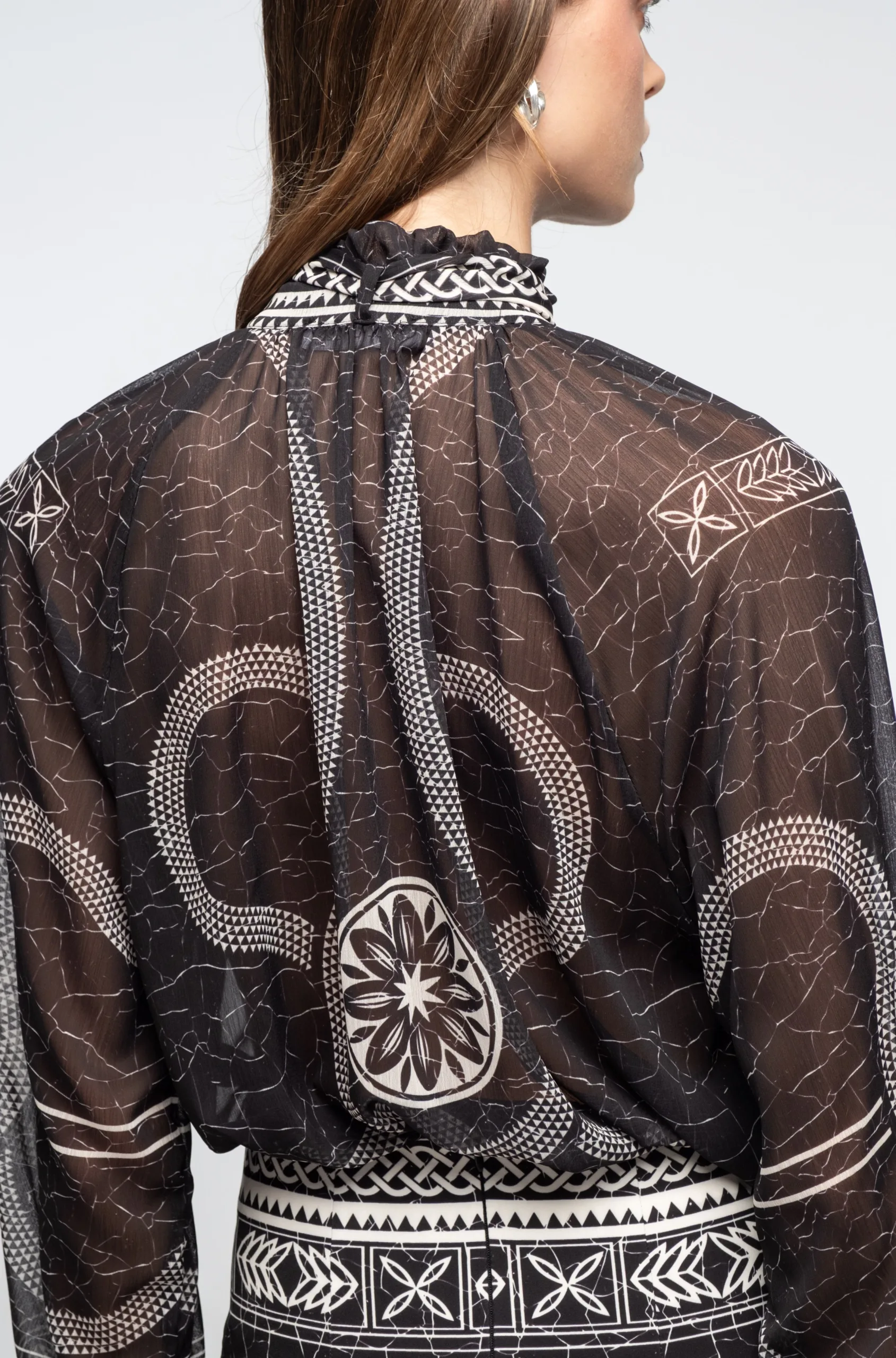 Το Philosophy Top ξεχωρίζει με τις θηλυκές του λεπτομέρειες, όπως τα βολάν στις ελαστικές μανσέτες, τον ψηλό γιακά και την αφαιρούμενη κορδέλα στον λαιμό