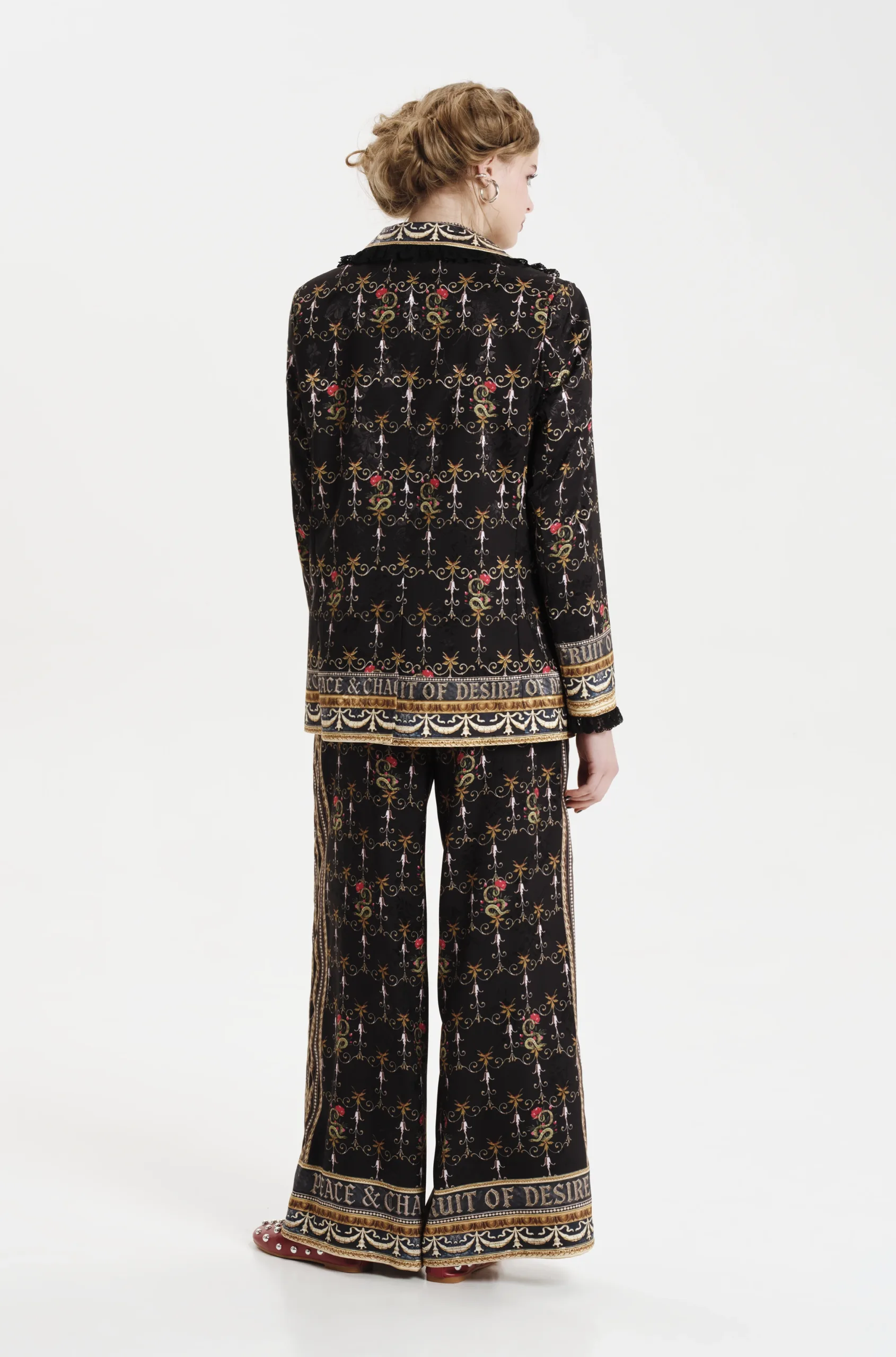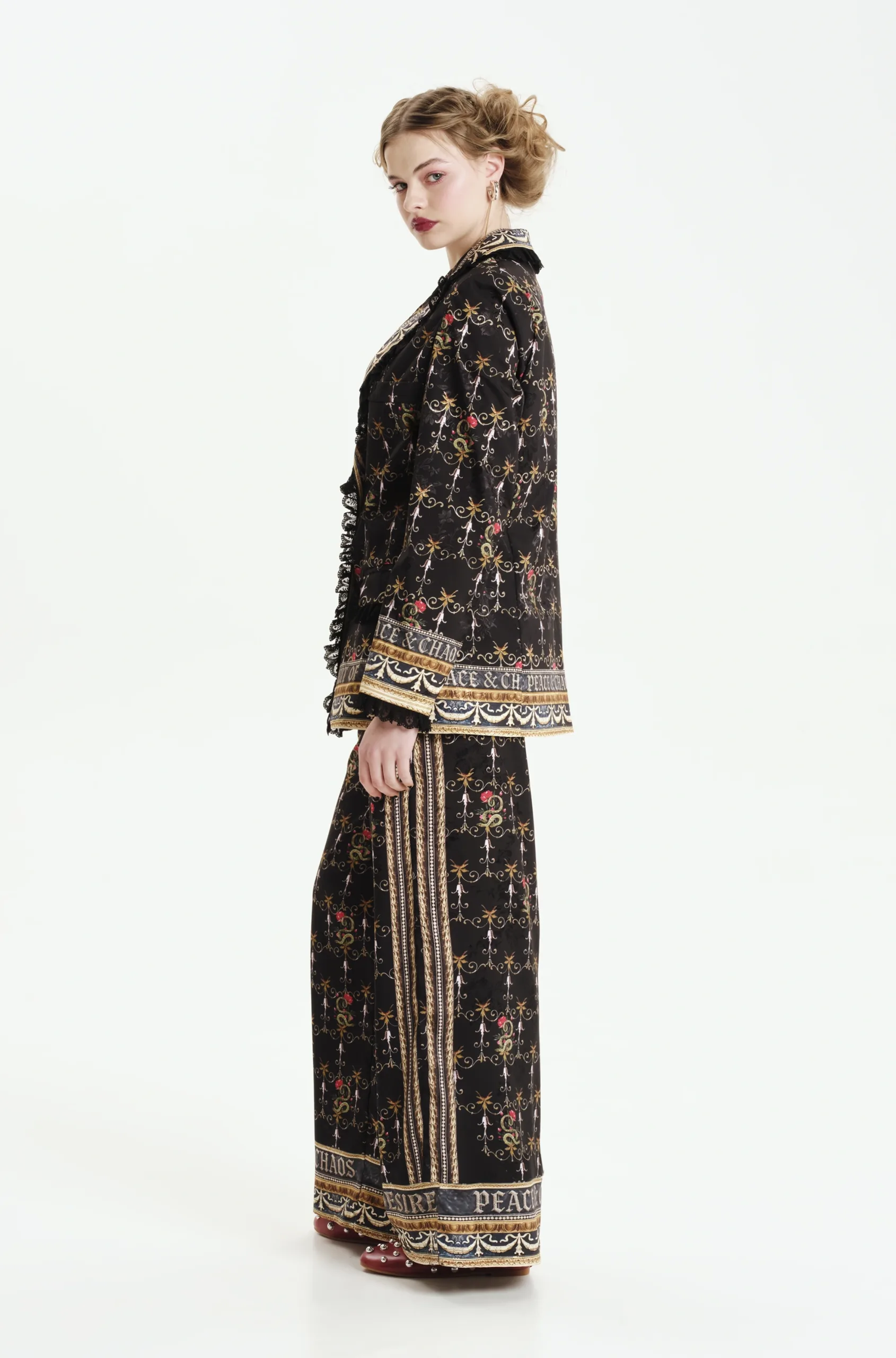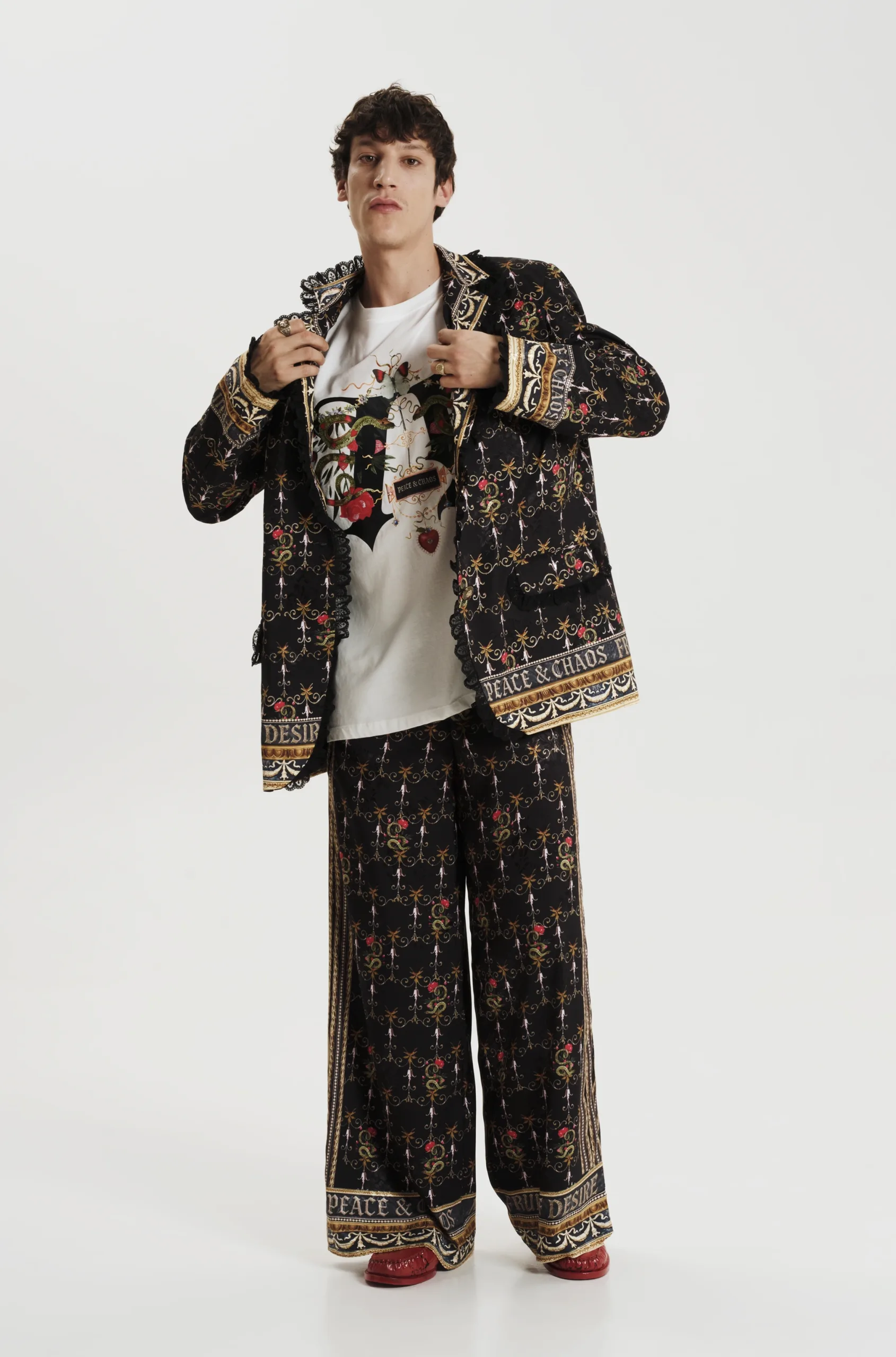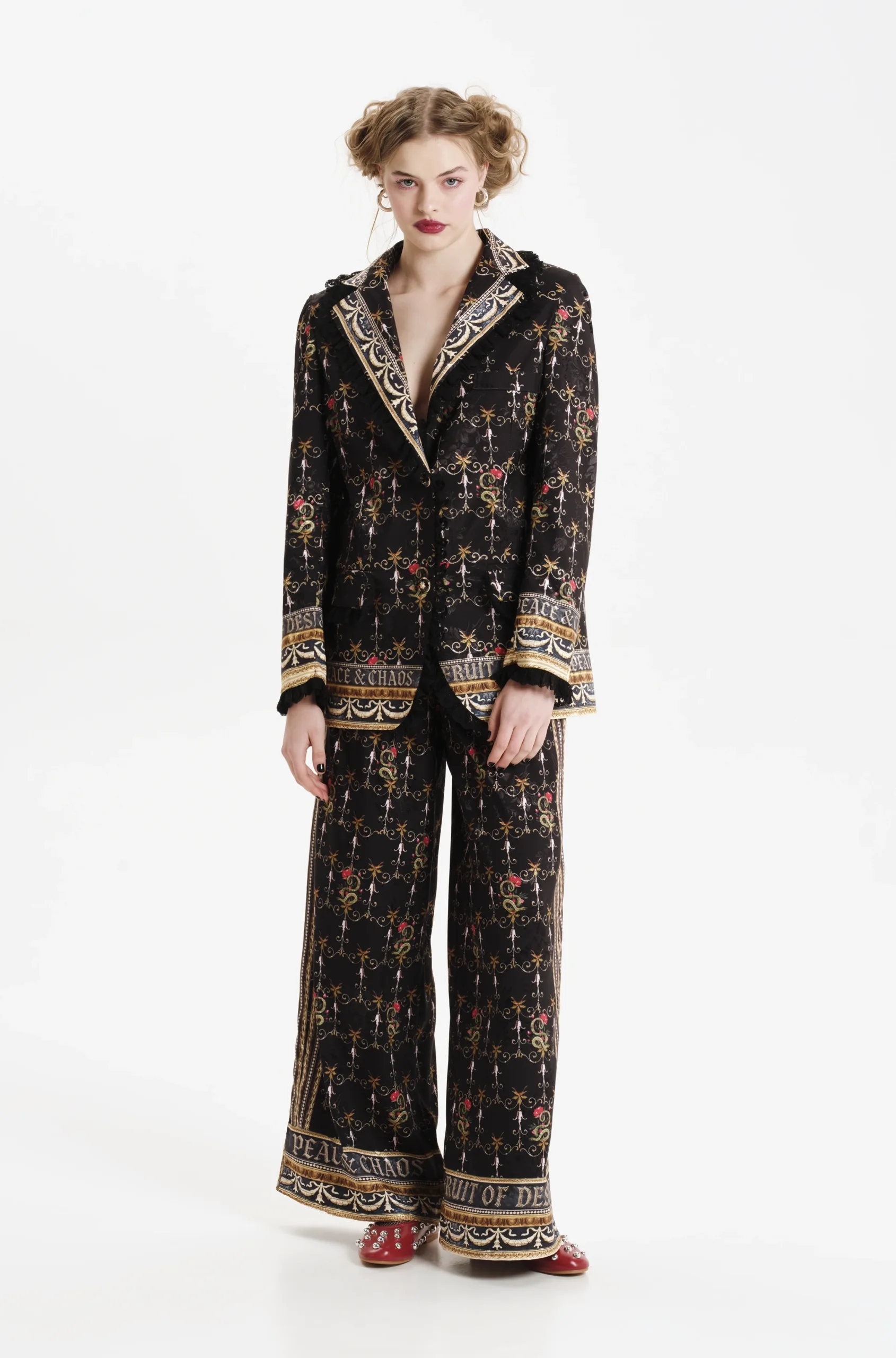 Το σακάκι Temptation σας αγκαλιάζει τον πλούσιο μαξιμαλισμό. Σε έναν συνδυασμό από βοτανικό σατέν ζακάρ και μια εκτύπωση τοποθέτησης από φίνες, μπαρόκ λεπτομέρειες, βρίσκονται σύμβολα δυαδικότητας και επιθυμίας. Οι αντίθετες λεπτομέρειες στο γιακά, τις μανσέτες και το στρίφωμα είναι διακοσμημένες με μαύρη δαντέλα με βολάν, μαζί με τις τσέπες με καπάκι. Αυτό το πλήρως επενδυμένο, χαλαρό σακάκι έχει φινίρισμα με εντυπωσιακά κουμπιά σε vintage στυλ. Τα ασορτί παντελόνια Temptation ολοκληρώνουν τη συνολική εμφάνιση.