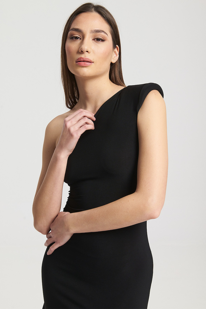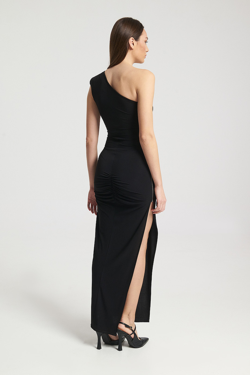 Γυναικείο φόρεμα με slim γραμμή. Διαθέτει maxi μήκος καθώς και λεπτομέρεια με σφηκοφωλιά πίσω. Είναι off shoulder και στην δεξιά μεριά έχει μεταλλικό φερμουάρ στο πλάι το οποίο καταλήγει σε άνοιγμα.